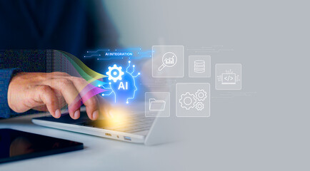 Hands typing on laptop with AI digital interface overlay, symbolizing artificial intelligence integration, big data analytics, and smart technology in daily work and personal life.