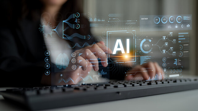 Data scientists. Man programmer using laptop analyzing and development at various information on futuristic virtual interface screen. Algorithm. marketing and deep learning of artificial intelligence