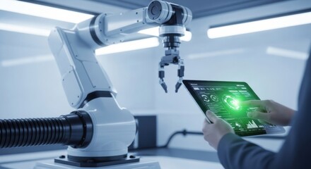 Robotic Arm Controlled by Tablet with Green Interface in Clean Industrial Setting