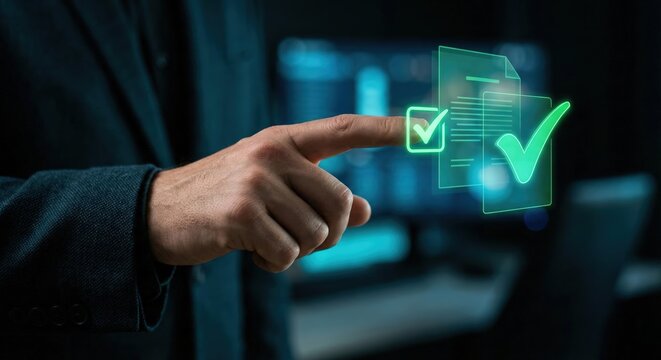 Businessman displaying digital checklist with glowing green check mark representing task completion and approval process