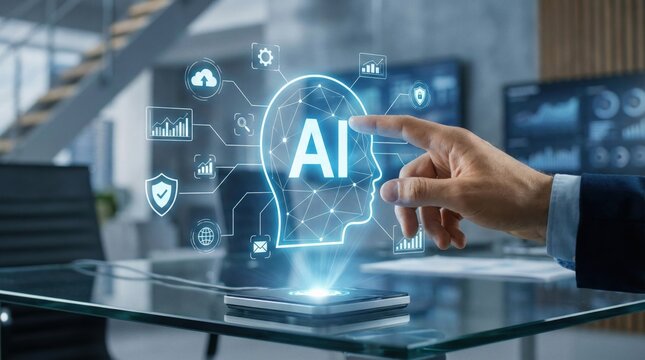 Artificial Intelligence concept with hand interacting with digital AI hologram surrounded by icons for data, analytics, security and automation