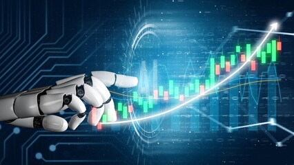 A futuristic robotic hand reaching towards a digital financial chart, highlighting themes of technology, investment, and data-driven growth in modern finance. Copula