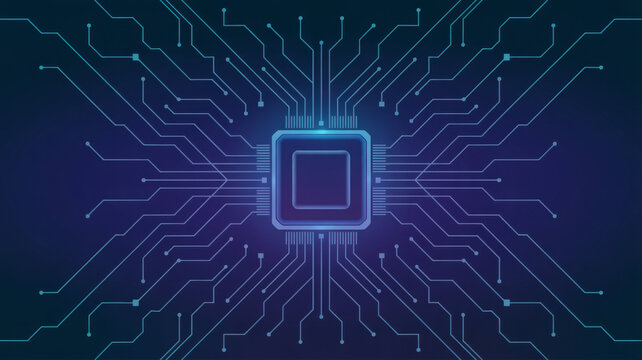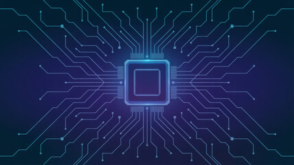 Central processing unit vector illustration futuristic microchip design with circuit board pattern isolated on dark blue background