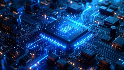 Intricate electronic circuit board with a powerful, glowing CPU, embodying the essence of cutting-edge technology, data processing, and the future of digital connectivity and intelligence