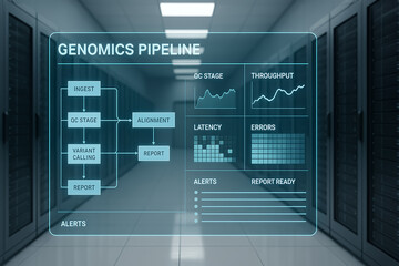 Futuristic Holographic Genomics Pipeline Interface Displaying Data Processing Stages in a HighTech Laboratory Corridor with RealTime Analytics Charts and Alerts Monitoring System