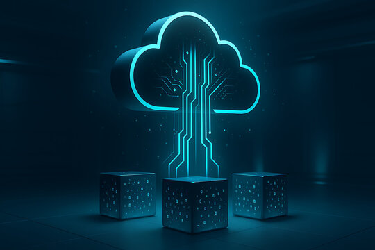 Conceptual 3d render of digital data transferring from a stylized electronic circuit cloud server down to individual computing storage cubes on a dark background for modern network infrastructure