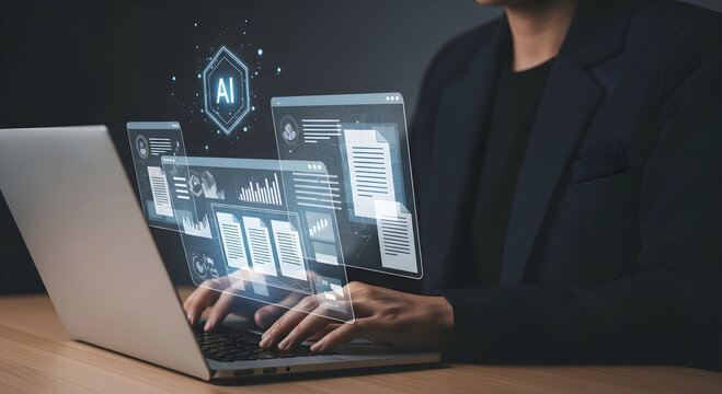 Person interacts with advanced artificial intelligence data visualizations on a laptop in a digital workspace