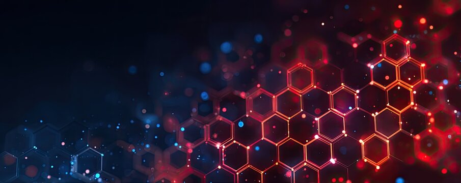 Glowing hexagonal pattern with red and blue light effects. Dark background with bokeh particles
