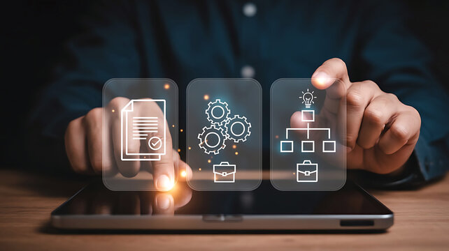 Person interacting with digital interface displaying business process workflow and document management icons on a tablet