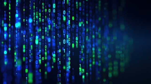 A visually striking digital representation of cascading binary code in green and blue, symbolizing data and technology.