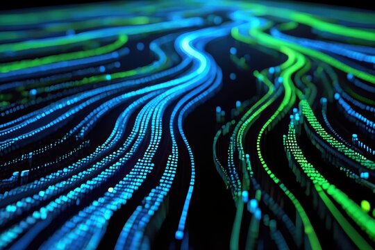 Green binary code streams flowing on dark background, creating a futuristic data flow visualization