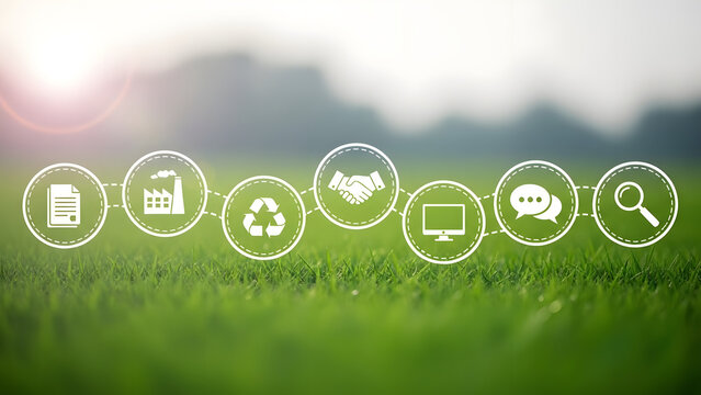 Seamless Integration of Sustainable Business Processes and Digital Solutions with Connecting Icons on a Vibrant Green Field Background