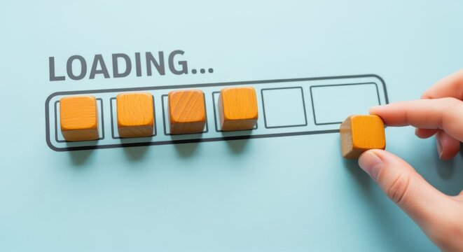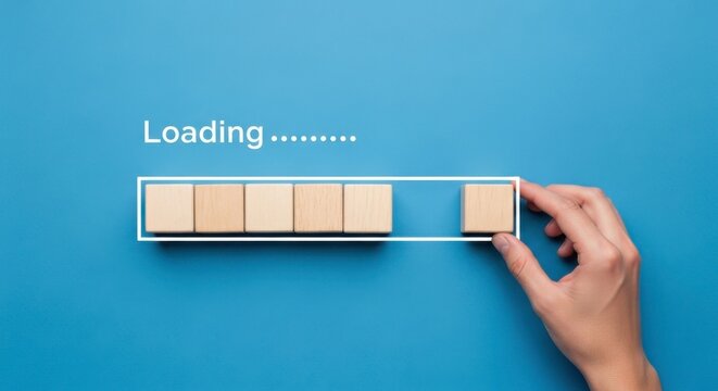 Loading Progress Concept with Wooden Blocks and Hand on Blue Background - Technology and Development