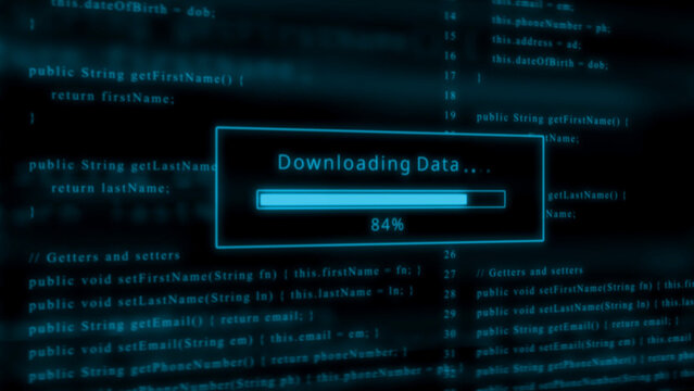 Blue progress bar indicates downloading data at 84 percent with a background of scrolling code Keywords: computer, code, programming, software, download, data, progress, bar, loading, technology