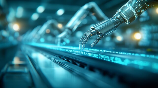 A cyber-enhanced factory with a digital tech overlay, featuring robotic arms, conveyor belts, and industrial automation. Generative AI