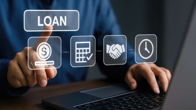 A person interacting with digital loan icons on a laptop, showcasing financial technology.