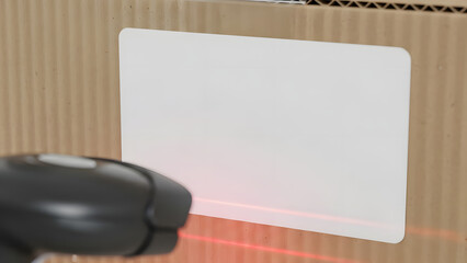 Barcode scanner reading label on cardboard box with red laser
