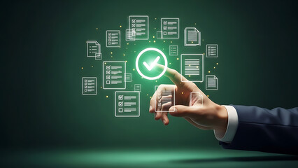 A hand in a suit points at a glowing green checkmark surrounded by digital document icons.