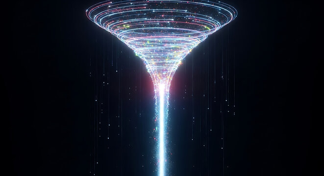 Digital funnel of flowing data particles forming an abstract glowing light stream