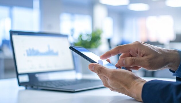 Digital Dynamics: A person interacts with a smartphone while a laptop displaying business analytics sits in the background, a study of modern technology's impact on business intelligence.
