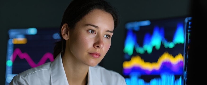 Advanced Data Analytics Dashboard on Modern Computer Displaying Statistical Graphs and Charts in Industrial Workspace Environment