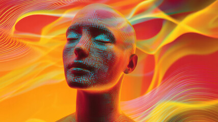A mannequin with digital text on its face, surrounded by flowing data waves, symbolizes AI and information flow.