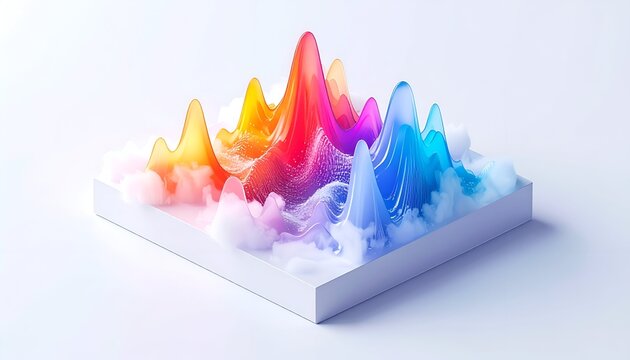 Colorful, abstract data visualization in a 3D landscape with smoke