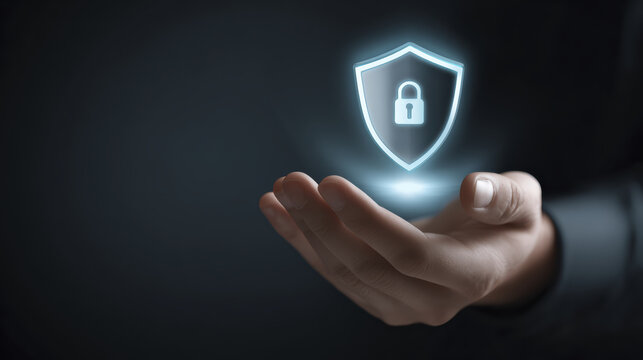 Cyber security shield lock protection hand digital safety icon data privacy information defense secure technology concept hologram safeguard
