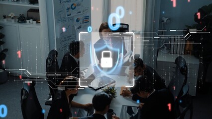 A modern office scene showcasing a secure digital workspace where a team collaborates on data protection strategies. Emphasis on technology and security. Raster