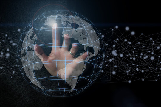 Hand touching global network and data exchanges over the world, Internet network for fast data exchange around planet Earth from space,