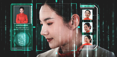 Facial recognition technology scan and detect people face for identification . Future concept interface showing digital biometric security system that analyze human face to verify personal data .