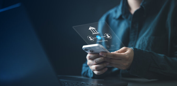 Fintech concept showing mobile banking interface on smartphone, representing digital payments, online transactions, financial technology, secure banking services, and modern cashless economy.