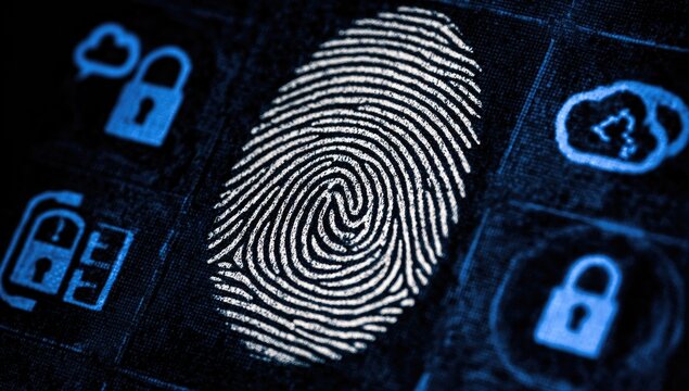 Digital padlock icon with a fingerprint pattern symbolizing biometric security and secure access