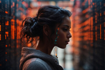 a woman in the room of a server data center with a neon light, a hacker infects their system with a virus