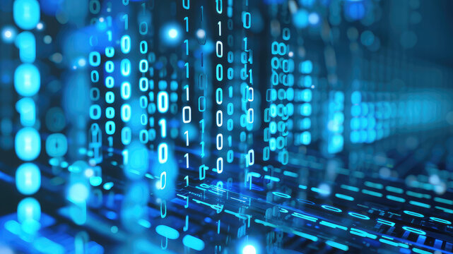 Binary stream, flow of information. Concept of blade server, storage, big data. modern mainframe disk storage with the data stream over in data center