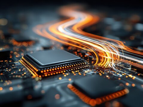 Close-up of a circuit board with glowing, energetic lines flowing over components