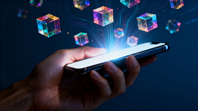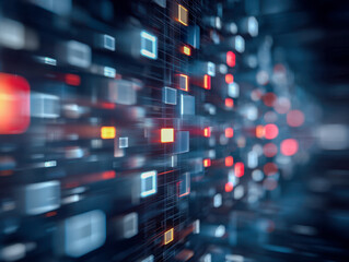Abstract digital network with glowing neon squares representing futuristic data flow and information technology connectivity in a dark technological environment