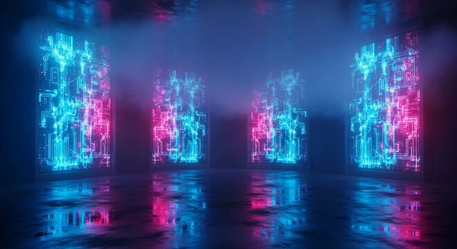 Futuristic Digital Data Pillars in Neon Blue and Pink Cyberpunk Environment
