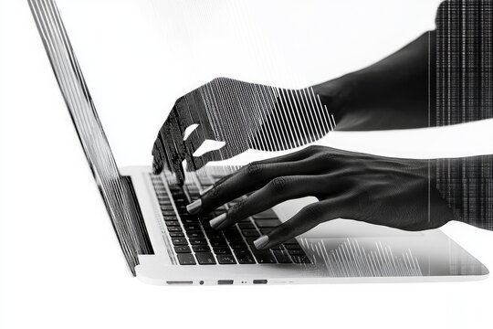 Hands Typing on Laptop with Futuristic Data Overlay and Smartwatch.