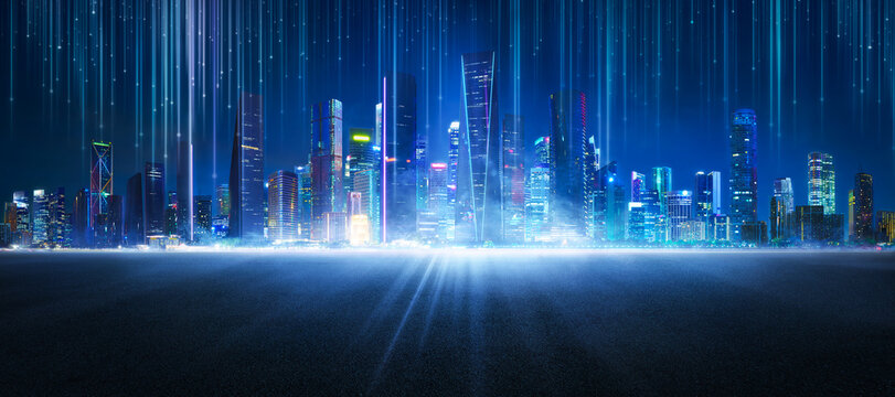 Night cityscape with glowing digital network overlay