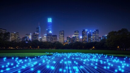 Dynamic digital cityscape featuring glowing data streams and vibrant lights at night