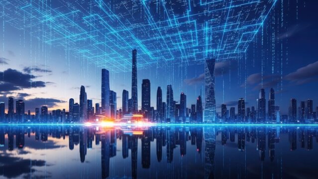 Stunning futuristic cityscape glowing with vibrant blue data streams representing digital connectivity and artificial intelligence