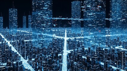 Night city skyline with cyan light streams and grid pattern. It represents a futuristic or digital landscape, technology or data flow concept