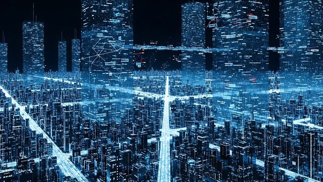 Abstract futuristic cityscape with glowing lights and digital data streams creating a sense of advanced technology and urban exploration