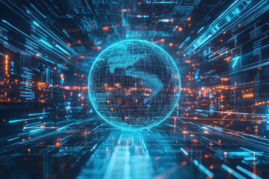 A digital representation of the Earth, illuminated, showcasing data streams and binary code