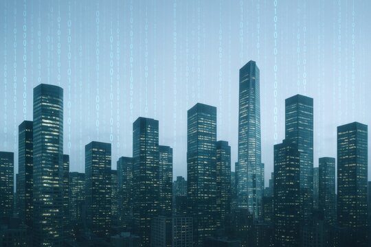 Futuristic Cityscape with Binary Code Overlay: Modern Metropolis, Data Streams, and Digital Innovation Concept