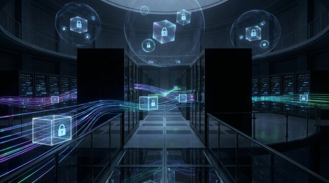 futuristic server room with glowing blue lights, encrypted data streams flowing through transparent cables, and secure digital locks hovering in the air