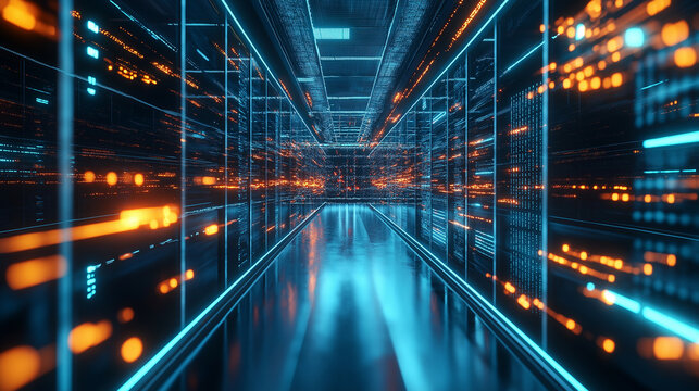 Digital information flowing through server room corridor