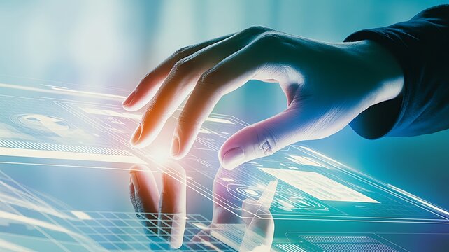 Close up of a hand interacting with glowing digital data streams