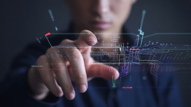 Person's finger interacting with futuristic digital interface glowing lines and data streams